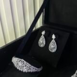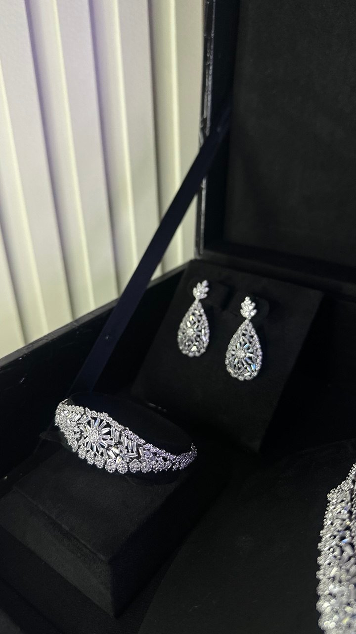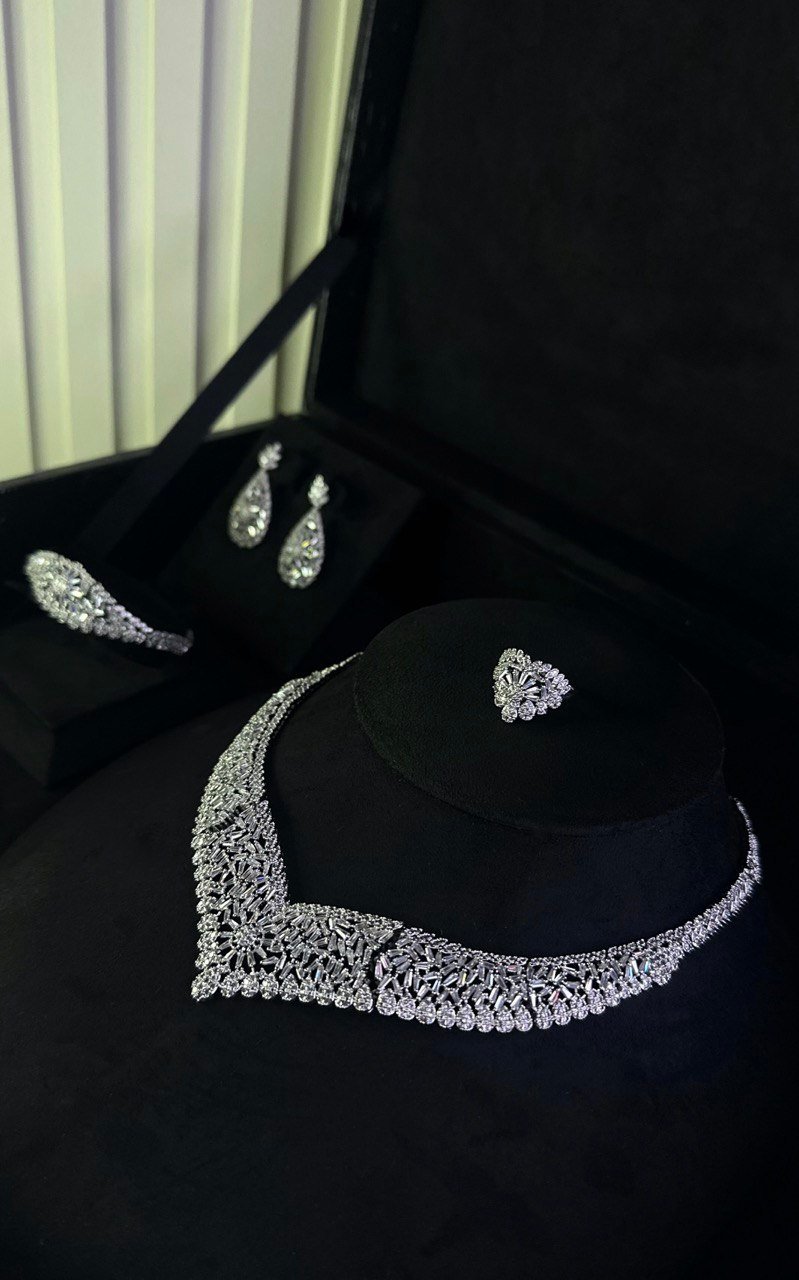 ارتقِ بإطلالتكِ مع هذا الطقم الساحر، المرصع بأجود أحجار الزركون التي تم قصّها بدقة فائقة لتبهركِ ببريق يضاهي بريق الألماس الحقيقي. مزيج مثالي يجمع بين الفخامة المطلقة والجودة المتينة ليدوم معكِ في أجمل مناسباتكِ.